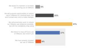 Global 2000 şirketleri VMware alternatiflerini ciddi biçimde değerlendiriyor. “Voice of Kubernetes Experts Report” araştırmasına göre katılımcıların %33’ü VMware kullanımını durdurduğunu veya durdurmayı planladığını belirtiyor.